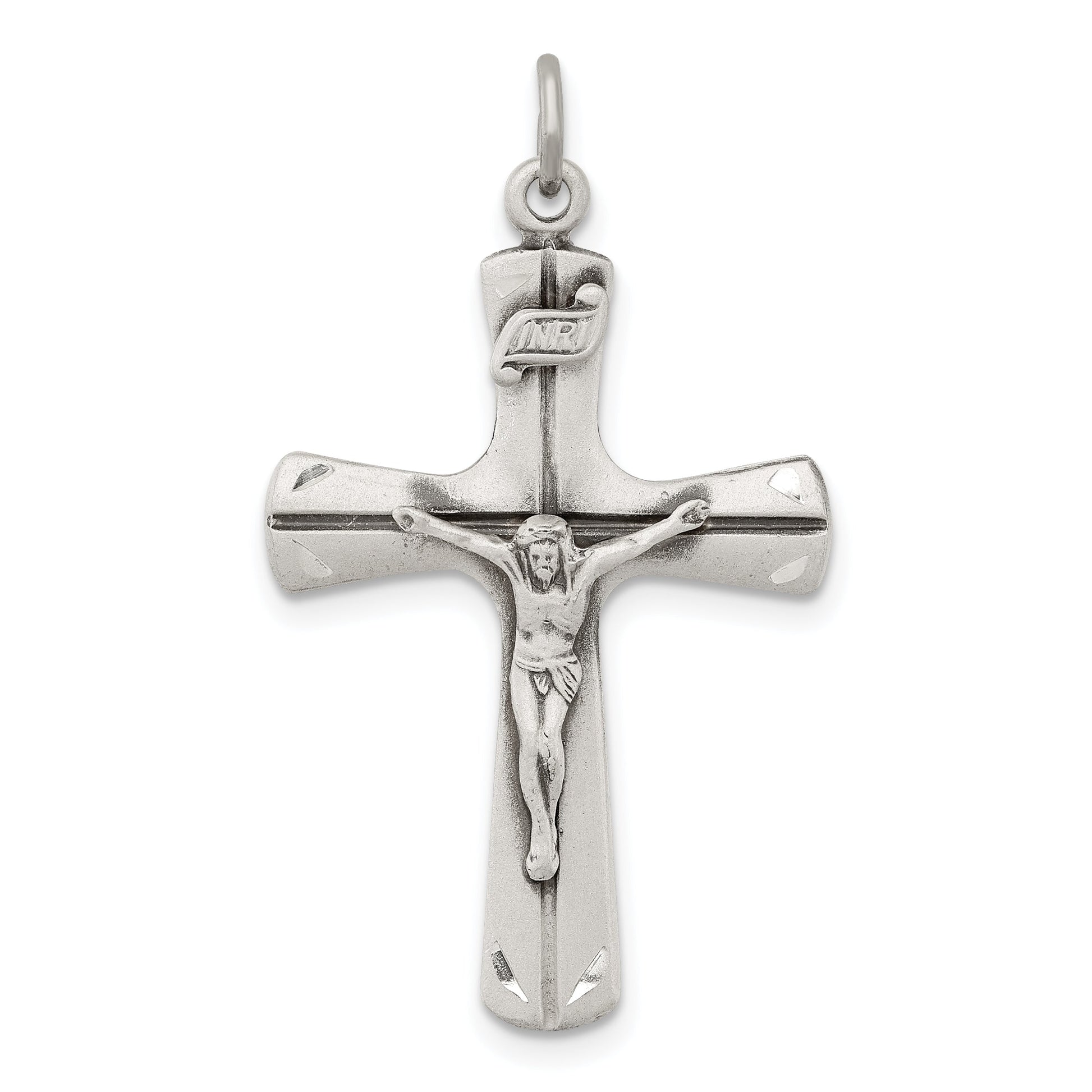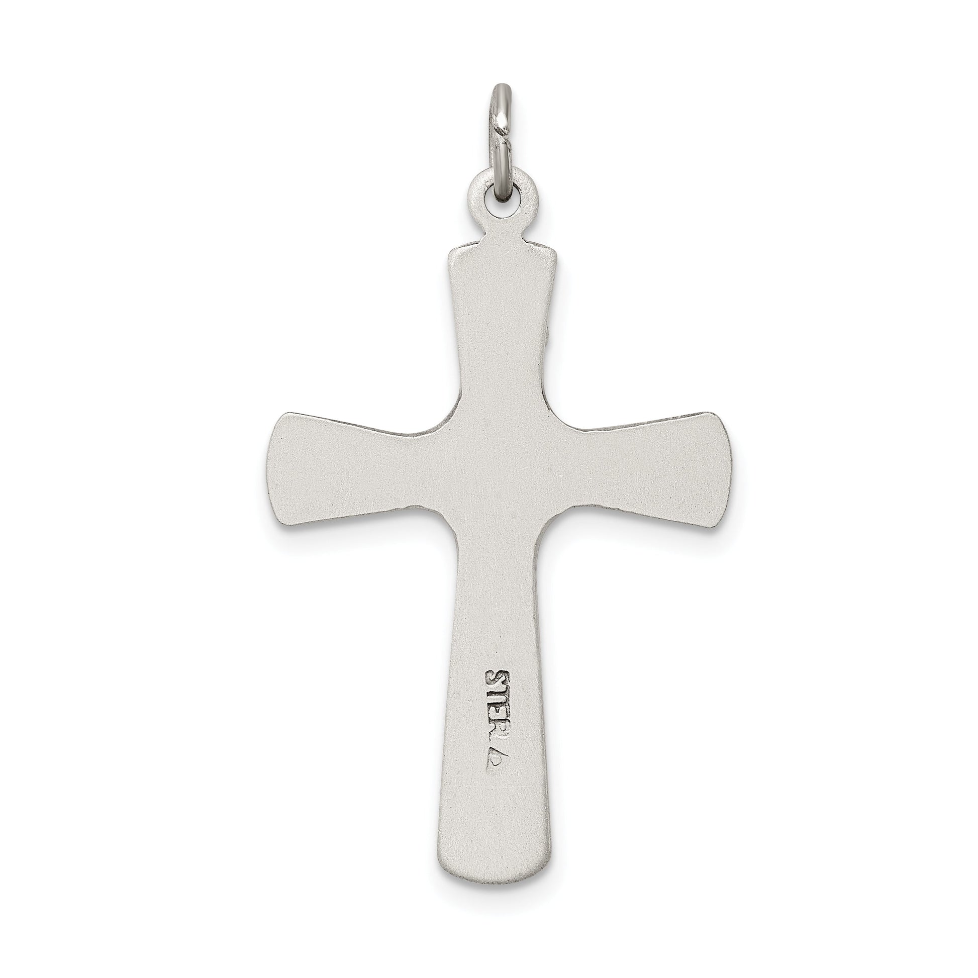 The Sterling Silver Satin Antiqued Crucifix Pendant showcases timeless elegance. Crafted from 925 sterling silver, this piece features a polished finish that enhances its classic appeal. Measuring 35 mm in length and 20 mm in width, the crucifix pendant possesses a flat back ensuring comfort against the skin. Its intricate design, achieved through a die-struck process, guarantees lasting durability. The satin antiqued details add a touch of vintage charm. Easy to wear with a 5 mm bail length, this pendant suits any chain. Embrace the beauty of the Sterling Silver Satin Antiqued Crucifix Pendant today.