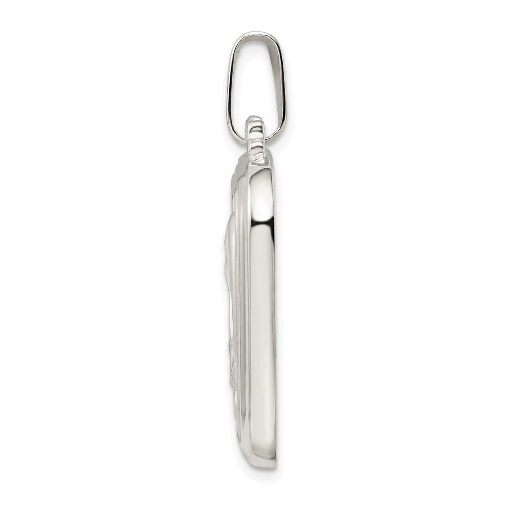 The Sterling Silver Satin & Polished Mary With Hail Prayer Pendant exudes timeless elegance and faith. Made from high-quality 925 sterling silver, this pendant showcases a stunning contrast between its smooth satin and polished finishes. The pendant is 40mm long and features a reversible design, adding versatility. Designed with meticulous detail, it has an anti-tarnish coating, ensuring its lasting shine. The textured backside adds a unique touch, while the solid build gives it durability. Perfect for daily wear or special occasions, the Sterling Silver Satin & Polished Mary With Hail Prayer Pendant is a treasured keepsake.
