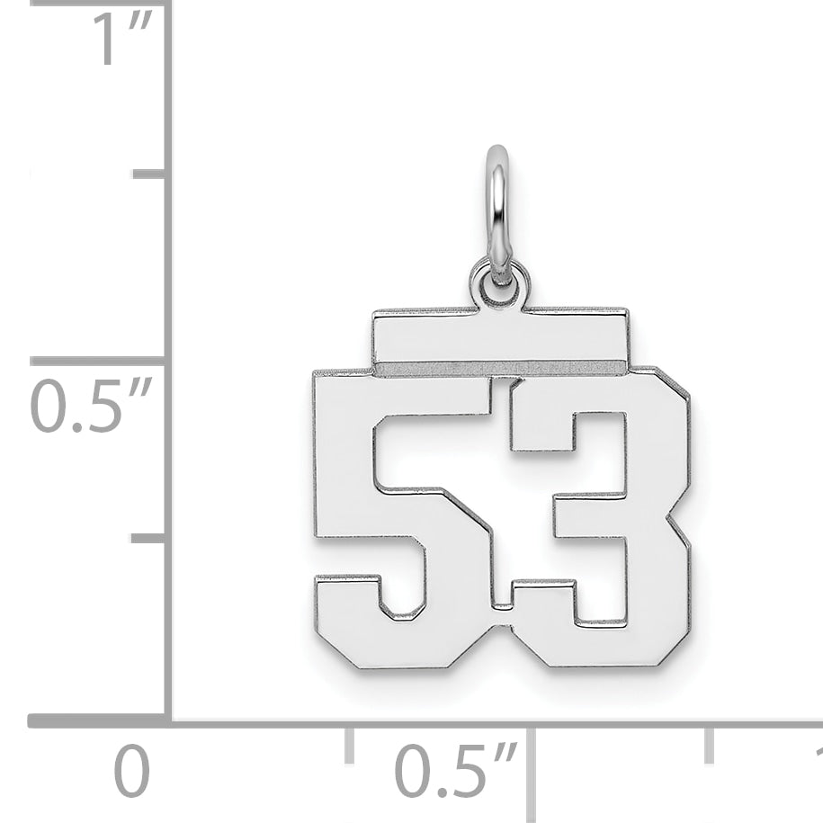 Introducing the Sterling Silver Silver/Rhodium-Plated Polished Number 53 Charm. This piece blends timeless elegance with modern flair. Crafted from high-quality 925 sterling silver, this charm boasts a rhodium-plated polished finish that enhances its radiant white sheen. The compact charm measures 20mm in length and 8mm in width, making it a delicate yet impactful accessory. Perfect for jewelry lovers, this small but stylish charm adds a sophisticated touch to any pendant or bracelet. The Sterling Silver Silver/Rhodium-Plated Polished Number 53 Charm is a must-have for those seeking to celebrate special moments with grace and style.