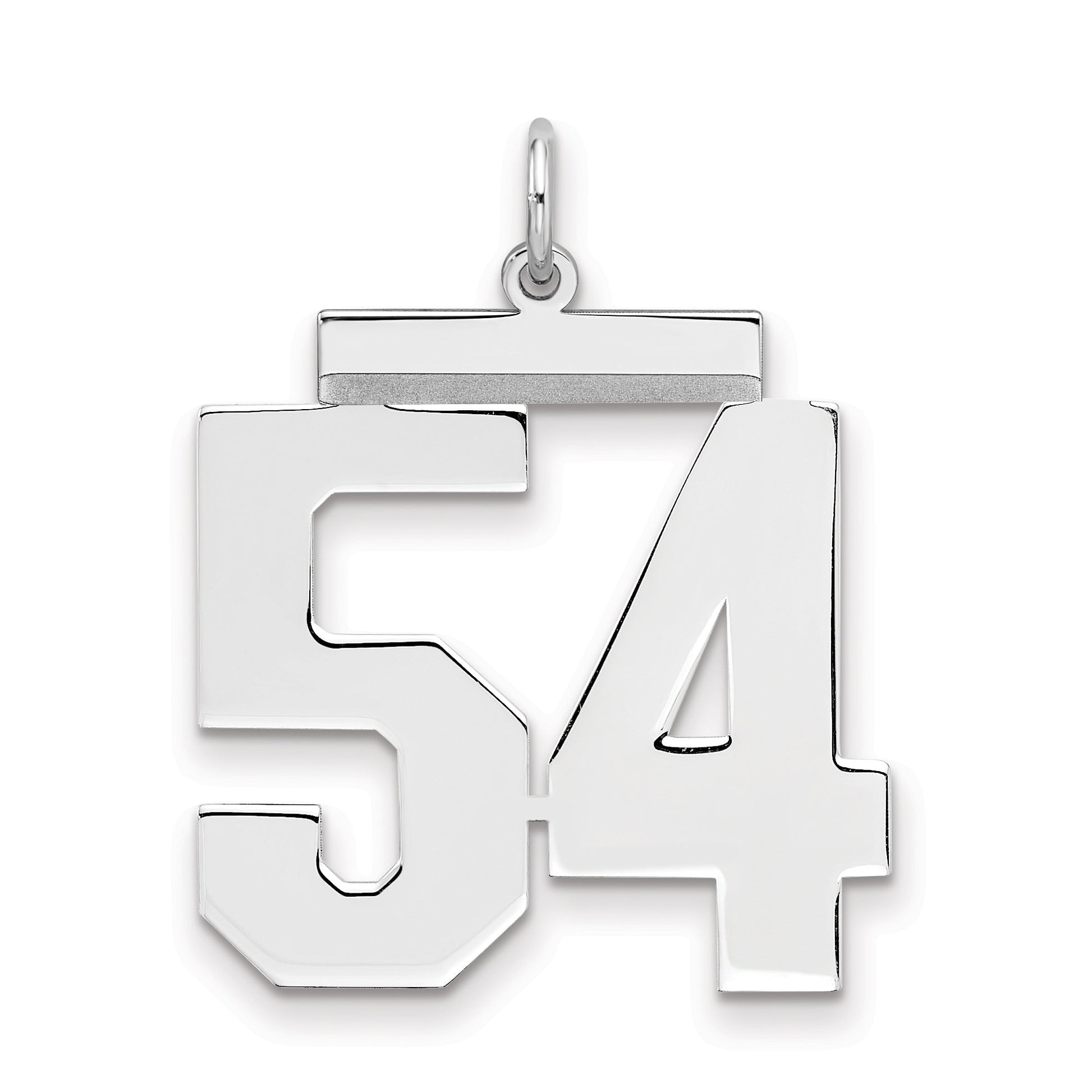 The Sterling Silver Silver/Rhodium-Plated Polished Number 54 Charm is a classy addition to any jewelry collection. Crafted from 925 sterling silver, this charm has a polished finish that catches the light beautifully. It is plated with rhodium, giving it a sleek silver tone that enhances its elegance and durability. Measuring 24 mm in length and 20 mm in width, this large, statement piece stands out on any necklace or bracelet. With its distinct number 54 design, this charm captures attention and secures compliments. Add a touch of sophistication to your accessories with this timeless charm.