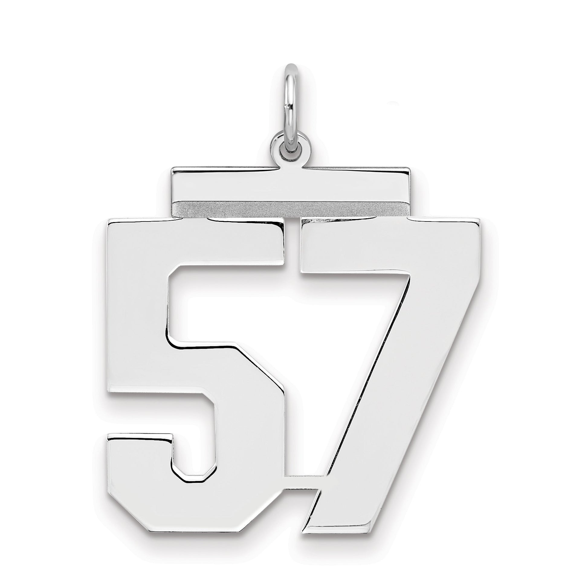 The Sterling Silver Silver/Rhodium-Plated Polished Number 57 Charm offers a bold, modern look with a bright, polished finish. Crafted from pure 925 sterling silver, it radiates elegance with its rhodium plating, ensuring a lasting sheen. This charm measures a substantial 24mm in length and 20mm in width, making it a versatile accessory perfect for pendants or bracelets. The large-sized dove-white charm catches the light, adding a dash of sophistication to any jewelry collection. Experience grace with the Sterling Silver Silver/Rhodium-Plated Polished Number 57 Charm — a blend of style and individuality.