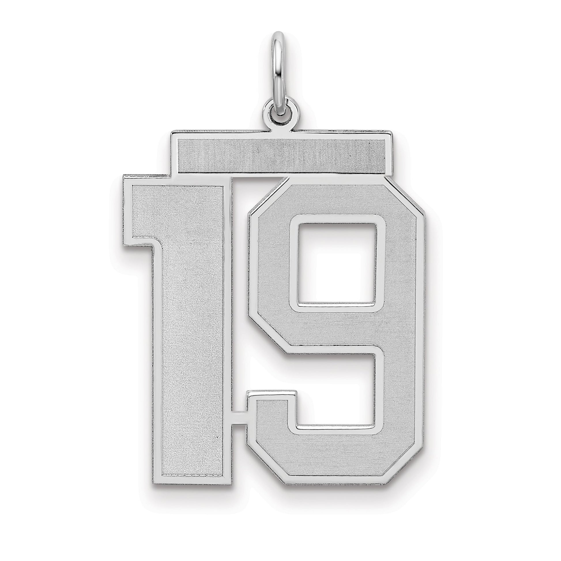 The Sterling Silver Silver/Rhodium-Plated Satin Number 19 Charm is a perfect piece to showcase your unique style. Crafted from pure 925 sterling silver and adorned with a sleek rhodium finish, this charm dazzles with its polished and laser-cut design. Measuring 25mm in length and 21mm in width, it's substantial enough to make a chic statement. The charm's silver tones add a touch of elegant shine, while its satin finish delivers a sophisticated allure. Show your devotion to the number 19 with the Sterling Silver Silver/Rhodium-Plated Satin Number 19 Charm.