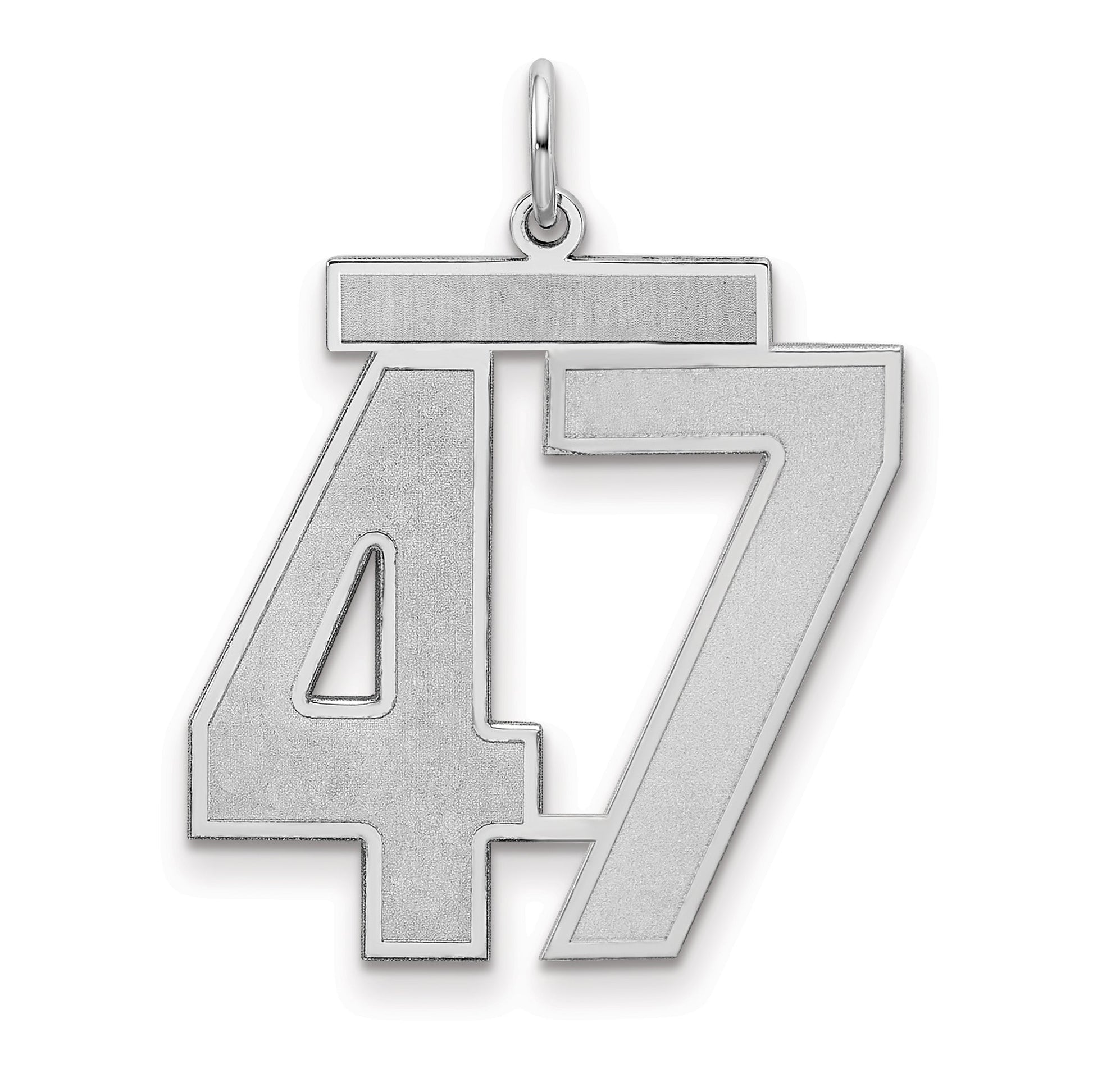 The Sterling Silver Silver/Rhodium-Plated Satin Number 47 Charm captures elegance and meaning. Crafted from high-quality 925 sterling silver, this charm features a polished and laser design finish, set with luxurious rhodium plating for added luster. The charm measures 25 mm in length and 21 mm in width, offering a significant presence as a pendant or keychain accessory. Its sleek silver tone and bold number "47" create a timeless appeal suitable for any occasion. The Sterling Silver Silver/Rhodium-Plated Satin Number 47 Charm lets you wear your favorite number with style and distinction.