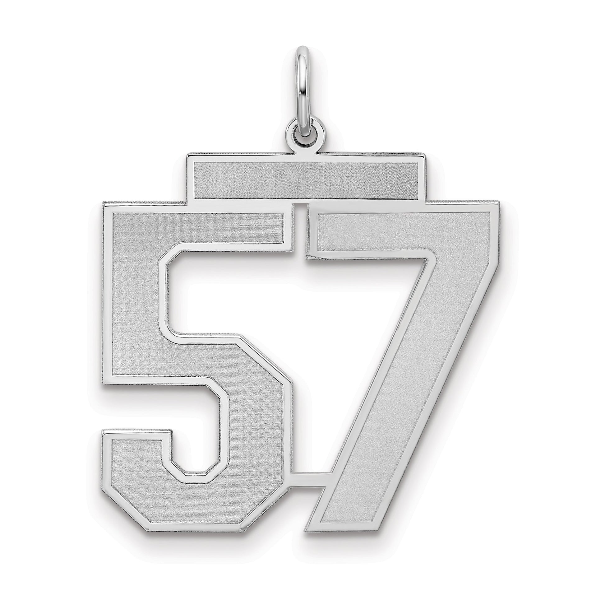 Introducing the Sterling Silver Silver/Rhodium-Plated Satin Number 57 Charm, a captivating piece for your charm collection. Crafted from 925 sterling silver, this charm features a polished and laser design that radiates elegance. With its rhodium plating, the piece has a silver tone that enhances its longevity and shine. Measuring 25 mm in length and 21 mm in width, it is large enough to make a statement yet subtle enough for everyday wear. The charm is lightweight, offering comfortable wear. Embrace your personal style with the unique number 57 charm today.