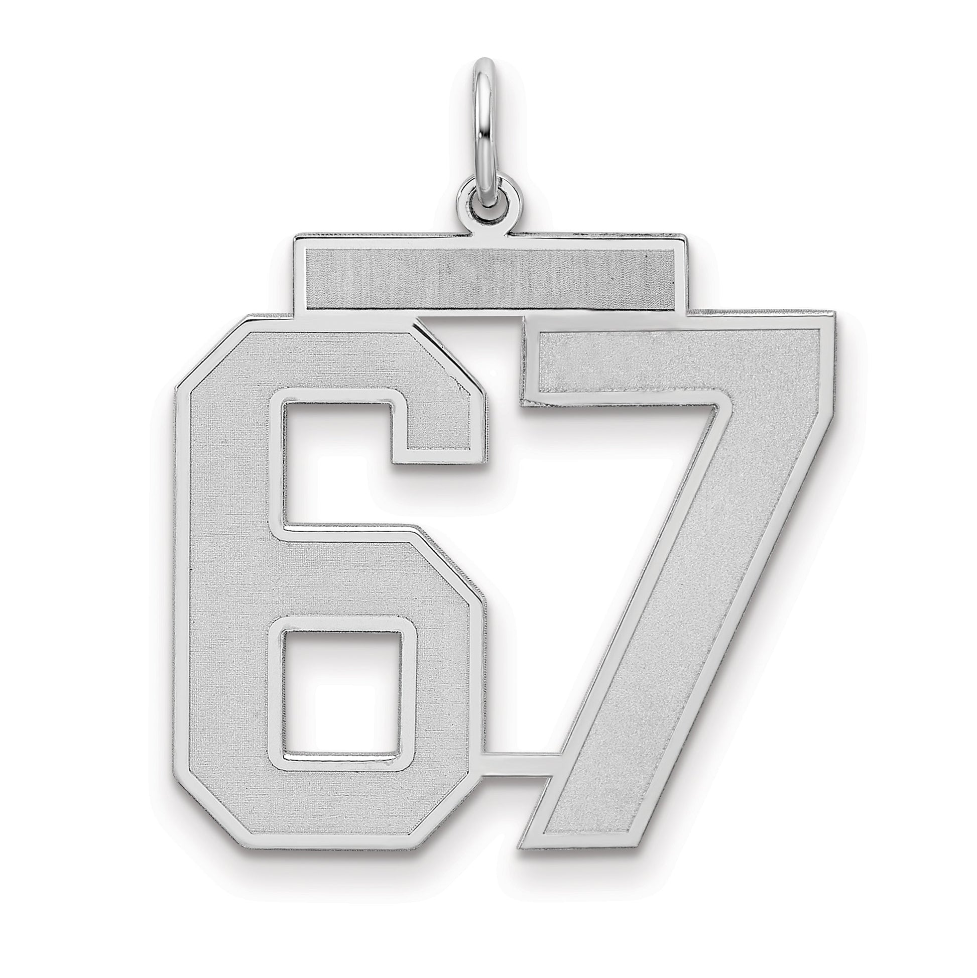 The Sterling Silver Silver/Rhodium-Plated Satin Number 67 Charm captures elegance and charm in one stunning piece. Made from 925 sterling silver, this pendant showcases detailed polished and laser designs, enhancing its appeal. Measuring 25 mm in length and 21 mm in width, the large-sized charm is perfect for expressing your individuality. Its sleek rhodium plating adds a touch of durability while maintaining a beautiful silver tone. Ideal for wearing solo or as part of a layered collection, the Sterling Silver Silver/Rhodium-Plated Satin Number 67 Charm embodies timeless style and grace.