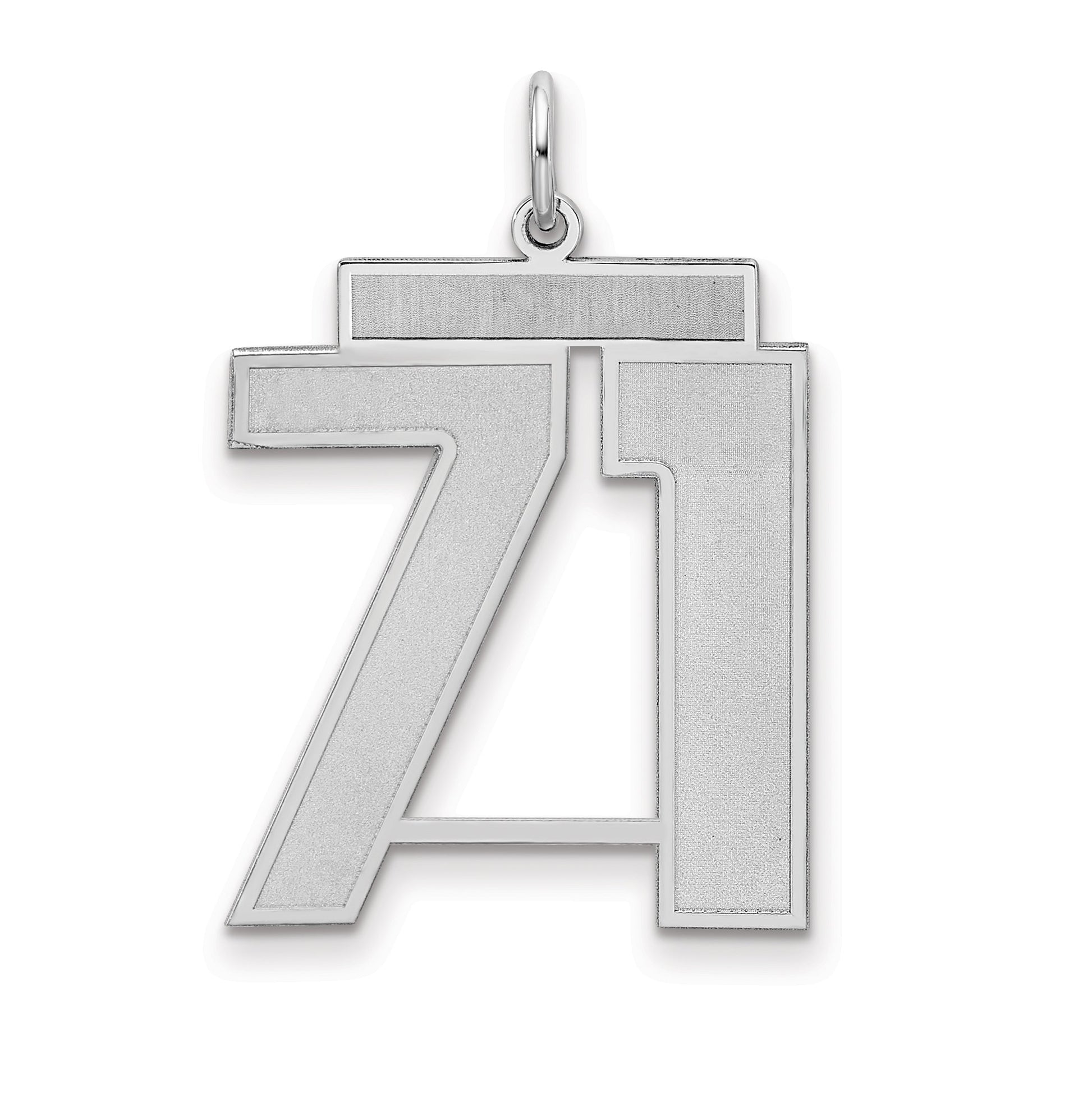 The Sterling Silver Silver/Rhodium-Plated Satin Number 71 Charm adds a unique touch to any outfit. Crafted from 925 sterling silver, this large pendant boasts a polished and laser design that enhances its elegance. The rhodium plating gives it a sleek silver tone, protecting the charm and maintaining its shine. With dimensions of 25mm in length and 21mm in width, this charm stands out with its bold presence. Ideal for charm bracelets or necklaces, the Sterling Silver Silver/Rhodium-Plated Satin Number 71 Charm is a stylish way to showcase a special number or milestone.