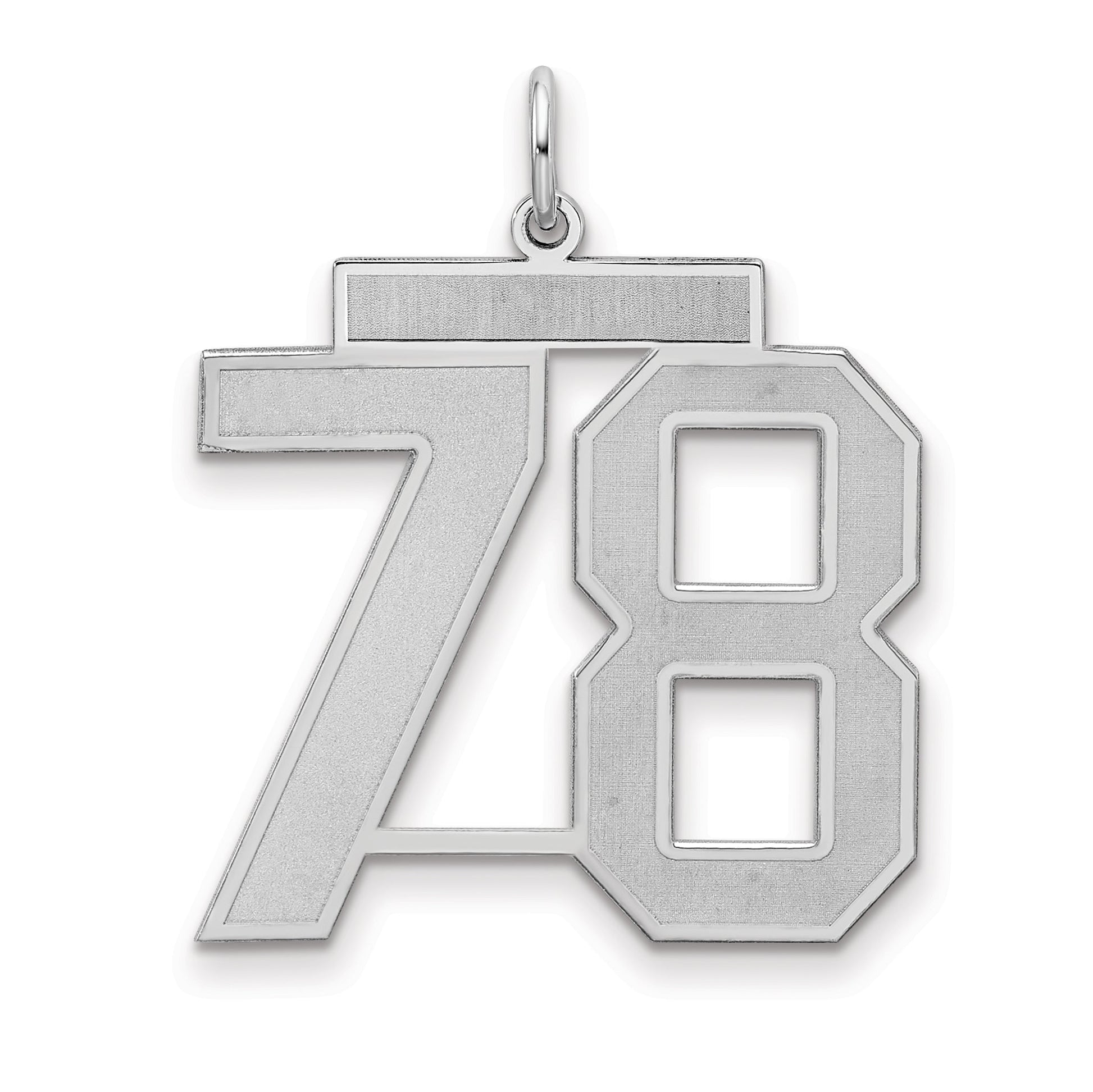The Sterling Silver Silver/Rhodium-Plated Satin Number 78 Charm offers a unique blend of style and quality. Made from 925 sterling silver, this charm shines with its polished and laser design. It boasts a rhodium plating for added durability and a dazzling silver tone. Measuring 25 mm in length and 21 mm in width, this large charm stands out as a statement piece. Its sleek, white color complements any outfit, making it a versatile addition to your jewelry collection. Elevate your style with the Sterling Silver Silver/Rhodium-Plated Satin Number 78 Charm.