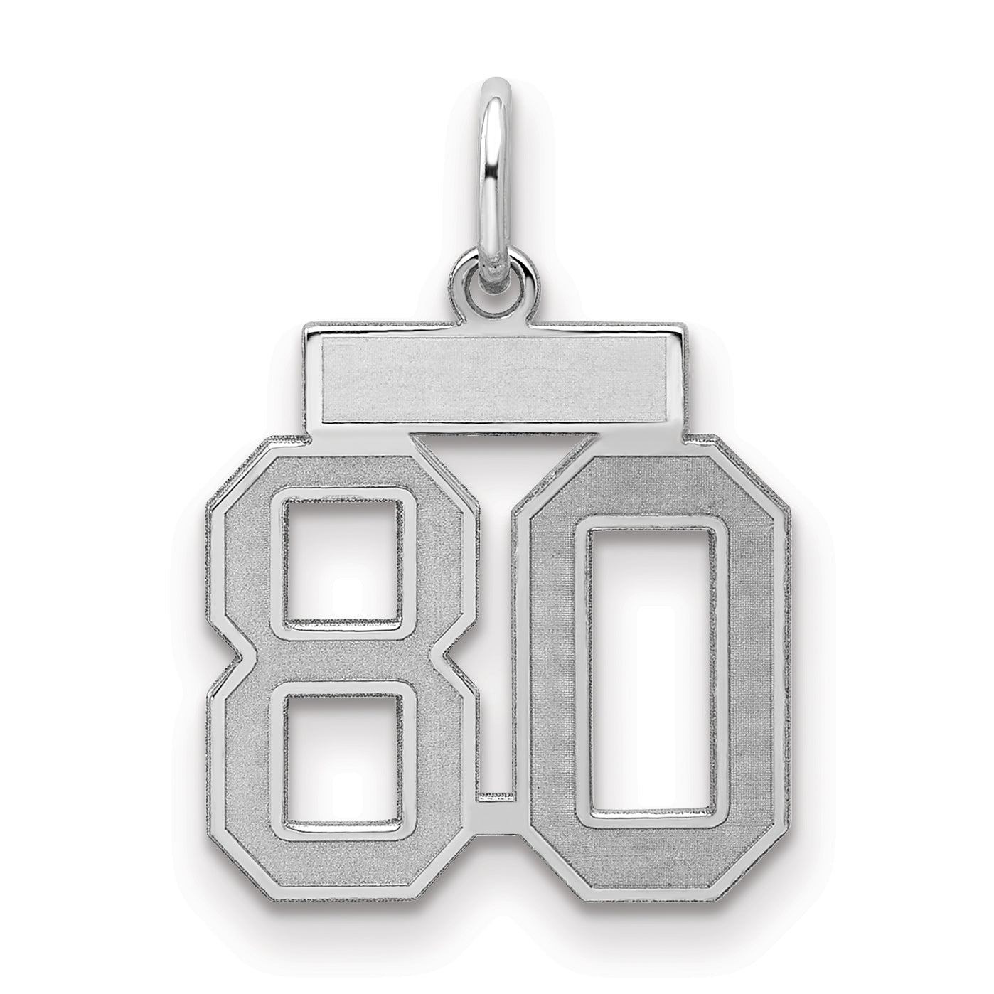 Introducing the Sterling Silver Silver/Rhodium-Plated Satin Number 80 Charm, a perfect blend of elegance and style. Crafted from 925 sterling silver, this stunning charm boasts a polished and laser-engraved design that captures the light beautifully. Measuring 19 mm in length and 14 mm in width, its small, yet eye-catching size makes it ideal for any jewelry collection. The rhodium plating ensures a long-lasting, silver tone finish, enhancing its durability and brilliance. Add a touch of luxury to your look with the Sterling Silver Silver/Rhodium-Plated Satin Number 80 Charm.