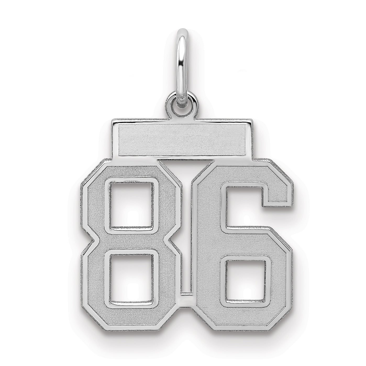 Introducing the Sterling Silver Rhodium-Plated Satin Number 86 Charm, a captivating accessory that adds a personal touch to any collection. Crafted from pure 925 sterling silver, this charm dazzles with its polished and laser-cut design. Measuring 19 mm in length and 14 mm in width, its compact size ensures it fits seamlessly into everyday wear. The rhodium plating keeps its silver tone shining bright, while the satin finish enhances elegance. Ideal as a pendant or charm, this piece lets you proudly display the number 86 with style and sophistication.