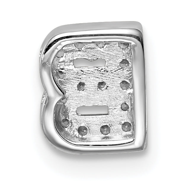 Meet the Sterling Silver Rhodium-Plated CZ Letter B Initial Slide Charm. This charm boasts fine craftsmanship with high-grade 925 sterling silver, ensuring durability and elegance. Adorned with clear cubic zirconia stones, it catches the light beautifully and adds sparkle to any collection. The rhodium plating gives a brilliant silver tone and helps resist tarnish, keeping your charm pristine. This hand-cast piece is a solid treasure, crafted with care and precision. Perfect for expressing personal style, the Sterling Silver Rhodium-Plated CZ Letter B Initial Slide Charm makes a classy statement.