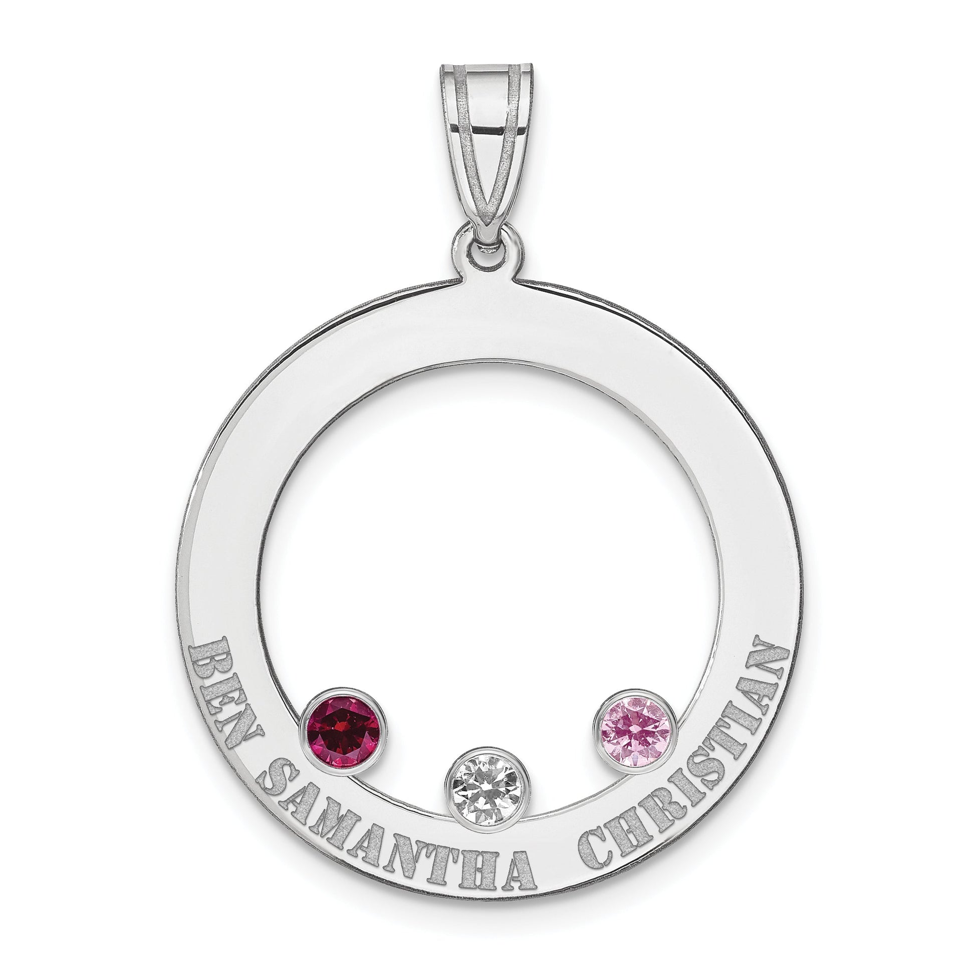 Introducing the Sterling Silver SS/Rhodium-Plated 3 Birthstone Circle with SS Bezel Family Pendant, a piece that showcases elegance. Crafted from 925 sterling silver and enhanced with rhodium plating, this pendant gleams with a silver tone. Personalized birthstones sit securely within the 29mm circular design, each bezel-set to highlight their unique charm. With a 25mm width, this pendant makes a bold statement, while its themed design adds a personal touch. It's ideal for celebrating family and cherished moments. Express yourself or gift it to someone special with this exquisite pendant, designed to captivate attention.