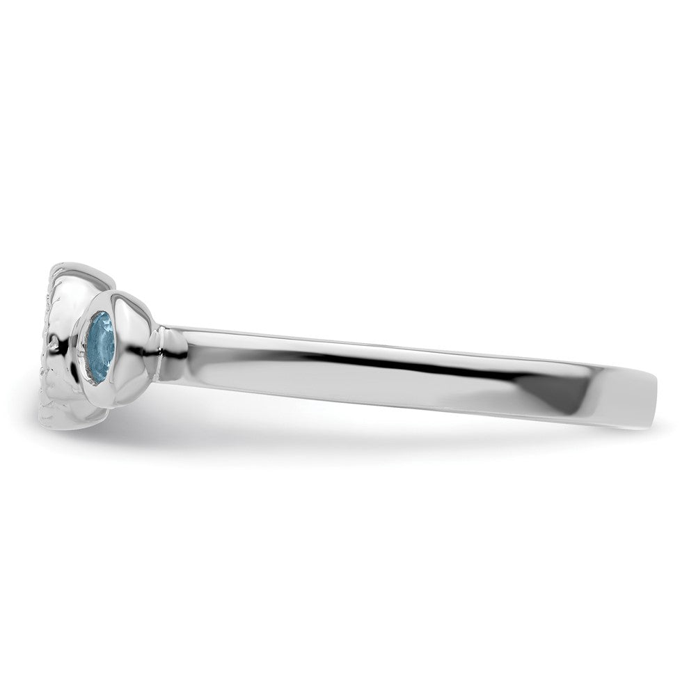 This is a beautiful ring made out of high-quality sterling silver. It has two round blue aquamarine stones and ten natural diamond stones. The aquamarine stones are set in a bezel while the diamond stones are set in a pave style. The ring is finished with rhodium plating and has a polished look. It is stackable with other rings, and its band width is 2.25mm. The total weight of the aquamarine stones is 0.22 carats, while the total weight of the diamond stones is 0.05 carats. The ring is solid and made through the casted manufacturing process. It weighs a total of gm per unit. This ring is a beautiful piece of jewelry and would look great on anyone who loves unique and elegant rings.