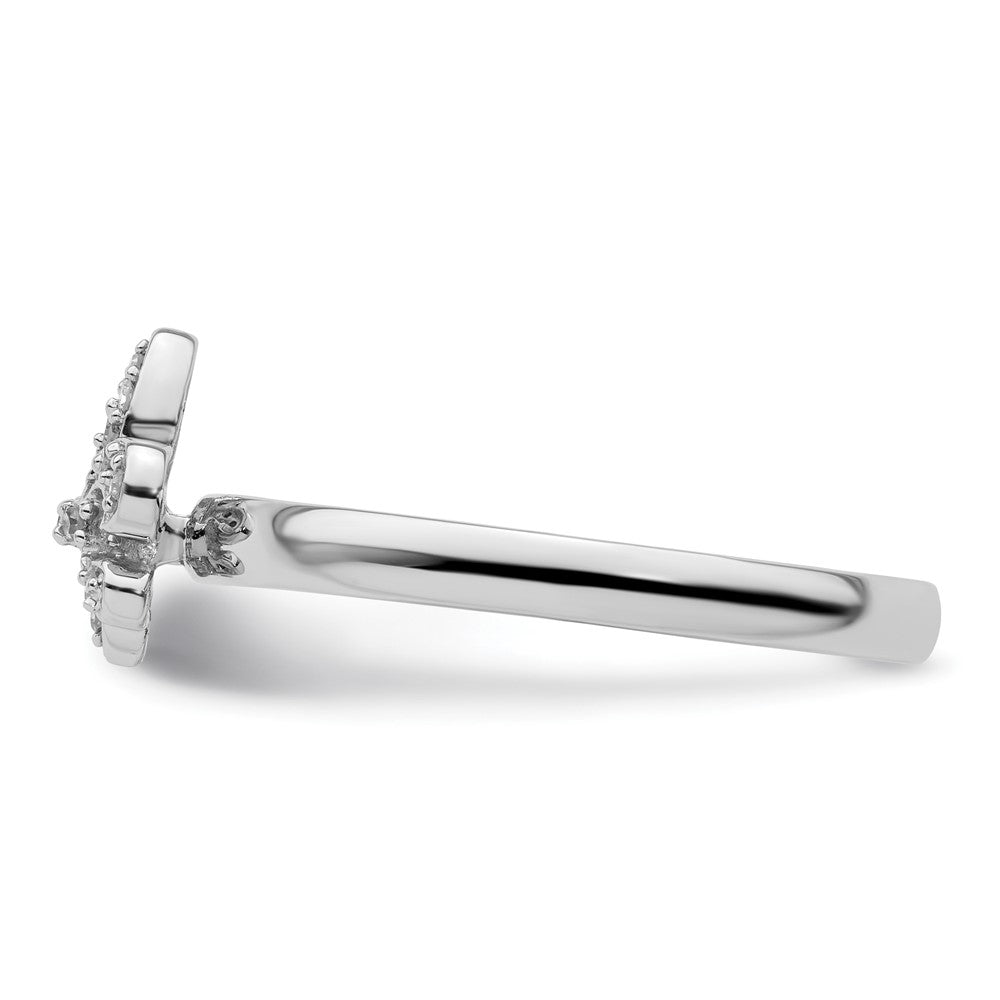 The Sterling Silver Stackable Expressions Fleur De Lis Diamond Ring is a sleek piece that adds charm to any outfit. Crafted from high-quality 925 sterling silver with a polished finish, this ring features 19 sparkling diamonds. The stones are beautifully prong set, with 11 larger 1mm and 8 smaller 0.9mm round diamonds, totaling 0.067 carats. Its solid design and rhodium plating give it durability and shine. The 2.25mm band is perfect for stacking or wearing solo for subtle flair. Elevate your jewelry game with the Sterling Silver Stackable Expressions Fleur De Lis Diamond Ring, crafted for style and longevity.