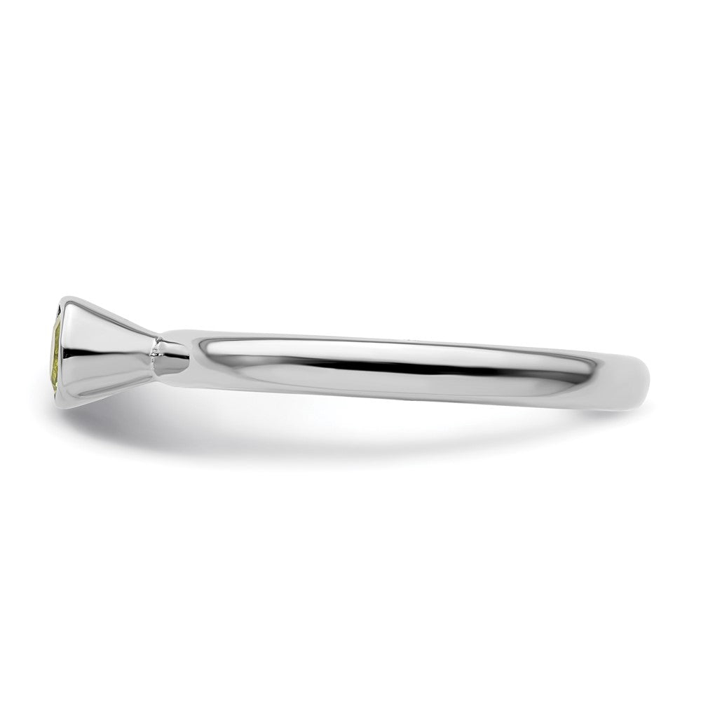Introducing the Sterling Silver Stackable Expressions High 4mm Round Peridot Ring, a sleek piece perfect for every jewelry lover. Crafted from pure 925 sterling silver, this ring boasts a polished finish that adds a shiny touch. The green Peridot gem, bezel set, measures 4mm and weighs about 0.293 carats. Its simple design fits well with other rings for a stylish layered look. Rhodium plating keeps it shiny and resistant to tarnish, making it ideal for daily wear. The Sterling Silver Stackable Expressions High 4mm Round Peridot Ring is a versatile piece that highlights your unique style with ease.