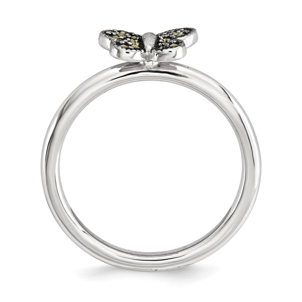 The Sterling Silver Stackable Expressions Marcasite Butterfly Ring is a charming upgrade to any jewelry box. Crafted from pure 925 sterling silver, this ring showcases a beautiful black marcasite stone set in a sleek, polished finish. Its solid design features a delicate 2.25 mm band that fits comfortably for everyday wear. The striking butterfly shape adds a fun touch, making it a perfect piece for stacking with other rings. Finished with rhodium plating, the ring is both durable and stylish. With its eye-catching look, the Sterling Silver Stackable Expressions Marcasite Butterfly Ring is a must-have for jewelry lovers.