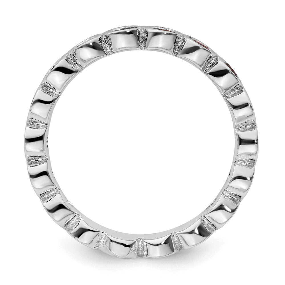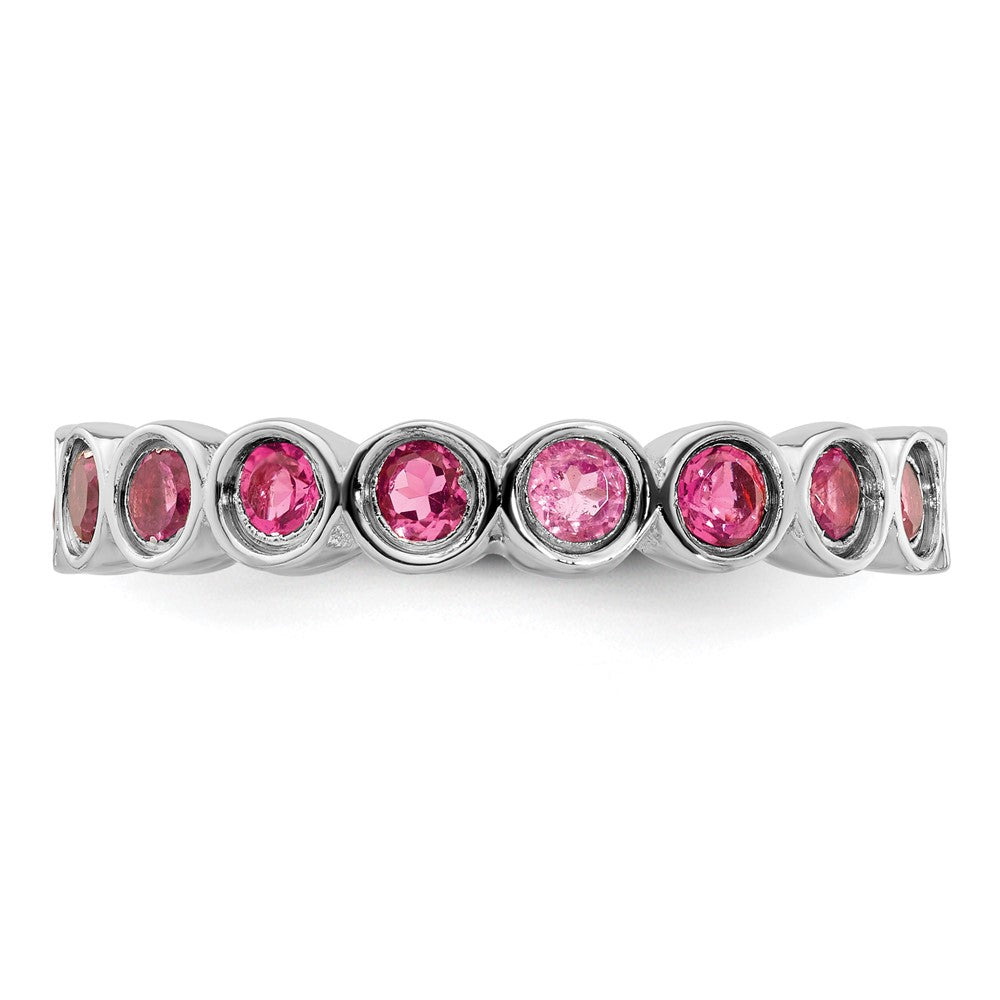 The Sterling Silver Stackable Expressions Pink Tourmaline Ring is a true find for jewelry lovers. This ring features 20 pink tourmaline stones, each 2.5 mm round, set in a sleek 3.5 mm band. Crafted from high-quality sterling silver with a polished finish and rhodium plating, it glows with a bright, white shine. The stones are bezel set for a snug fit. This eternity ring adds a touch of color and style to any look. Whether worn alone or stacked, the Sterling Silver Stackable Expressions Pink Tourmaline Ring makes a bold statement of elegance and charm.