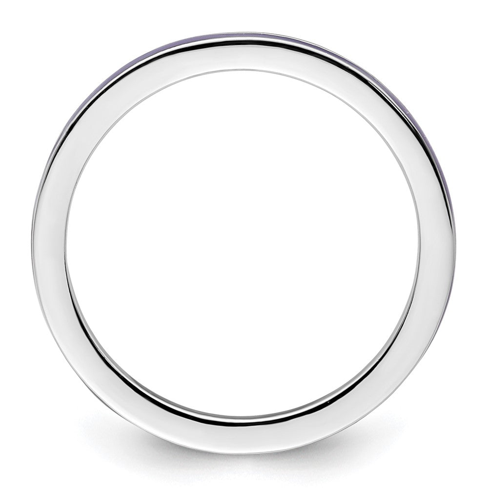 The Sterling Silver Stackable Expressions Purple Enameled 1.5mm Ring is a chic addition to any jewelry collection. Made from pure 925 sterling silver and polished to shine, this ring features a vibrant purple enamel accent that adds a splash of color. Its slim 1.5mm band makes it perfect for stacking with other rings. Rhodium plating gives it extra shine and durability. This solid, cast ring offers a sleek look with a bold pop of purple, making it ideal for everyday wear or layering. Elevate your style with the Sterling Silver Stackable Expressions Purple Enameled 1.5mm Ring today.