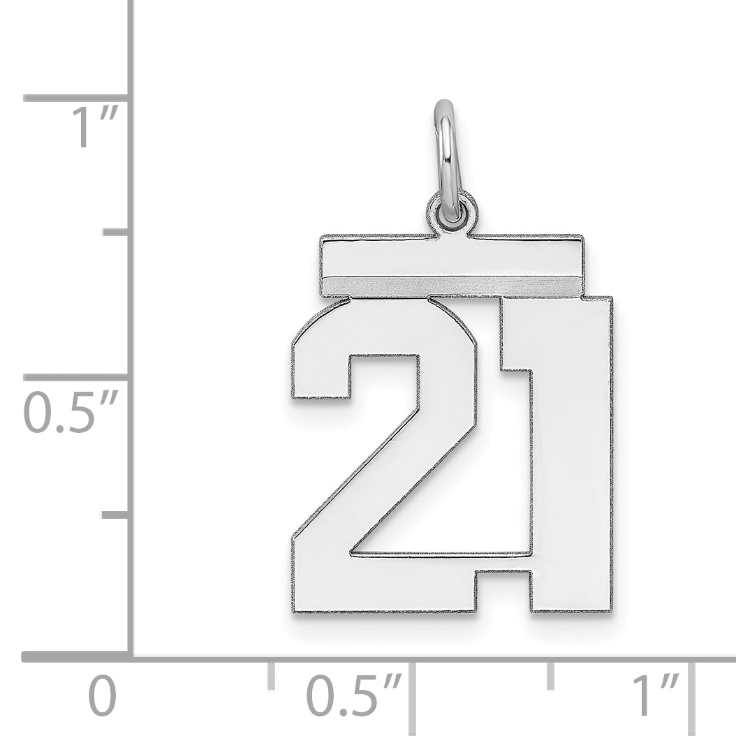 Celebrate a special milestone with the Sterling Silver Rhodium-Plated Polished Number 21 Charm. This elegant charm boasts a polished finish, crafted from high-quality 925 sterling silver. The rhodium plating adds a shiny, silver tone, enhancing its bright appearance while offering durability. Measuring 21 mm in length and 16 mm in width, the charm offers an ideal medium size to be worn or gifted as a pendant. Perfect for birthdays or anniversaries, it effortlessly blends with any necklace or bracelet. Add this Sterling Silver Rhodium-Plated Polished Number 21 Charm to your collection for a timeless touch of sophistication.