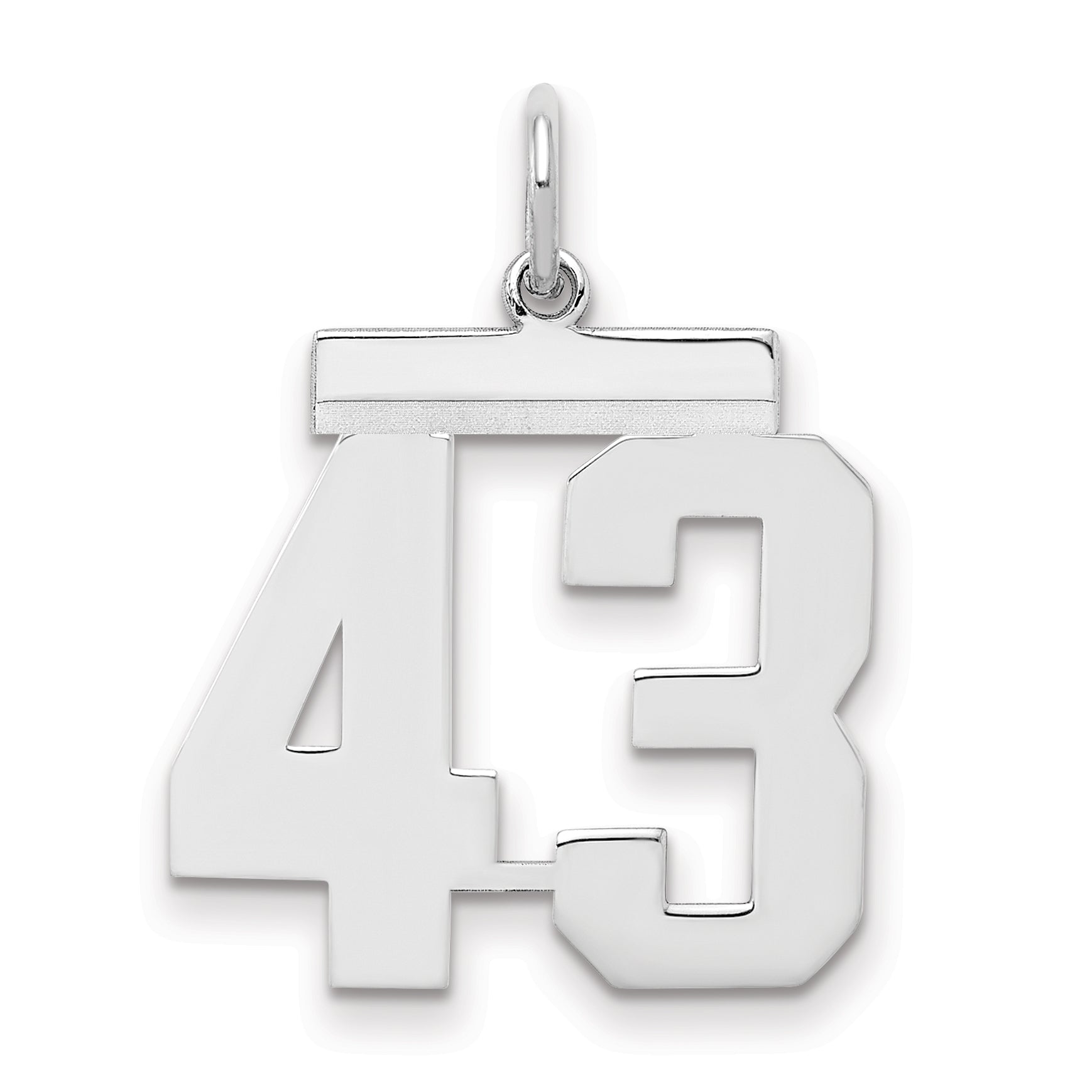 Introducing the Sterling Silver Rhodium-Plated Polished Number 43 Charm, a piece that combines elegance and meaning. Crafted from 925 sterling silver, this charm features a polished finish that glimmers with every movement. The rhodium plating provides a shiny, silver tone, adding durability and a tarnish-resistant quality to the piece. This medium-sized charm, measuring 21 mm in length and 16 mm in width, is perfect for adding a personal touch to any jewelry collection. Choose the Sterling Silver Rhodium-Plated Polished Number 43 Charm for a sleek and sophisticated statement.