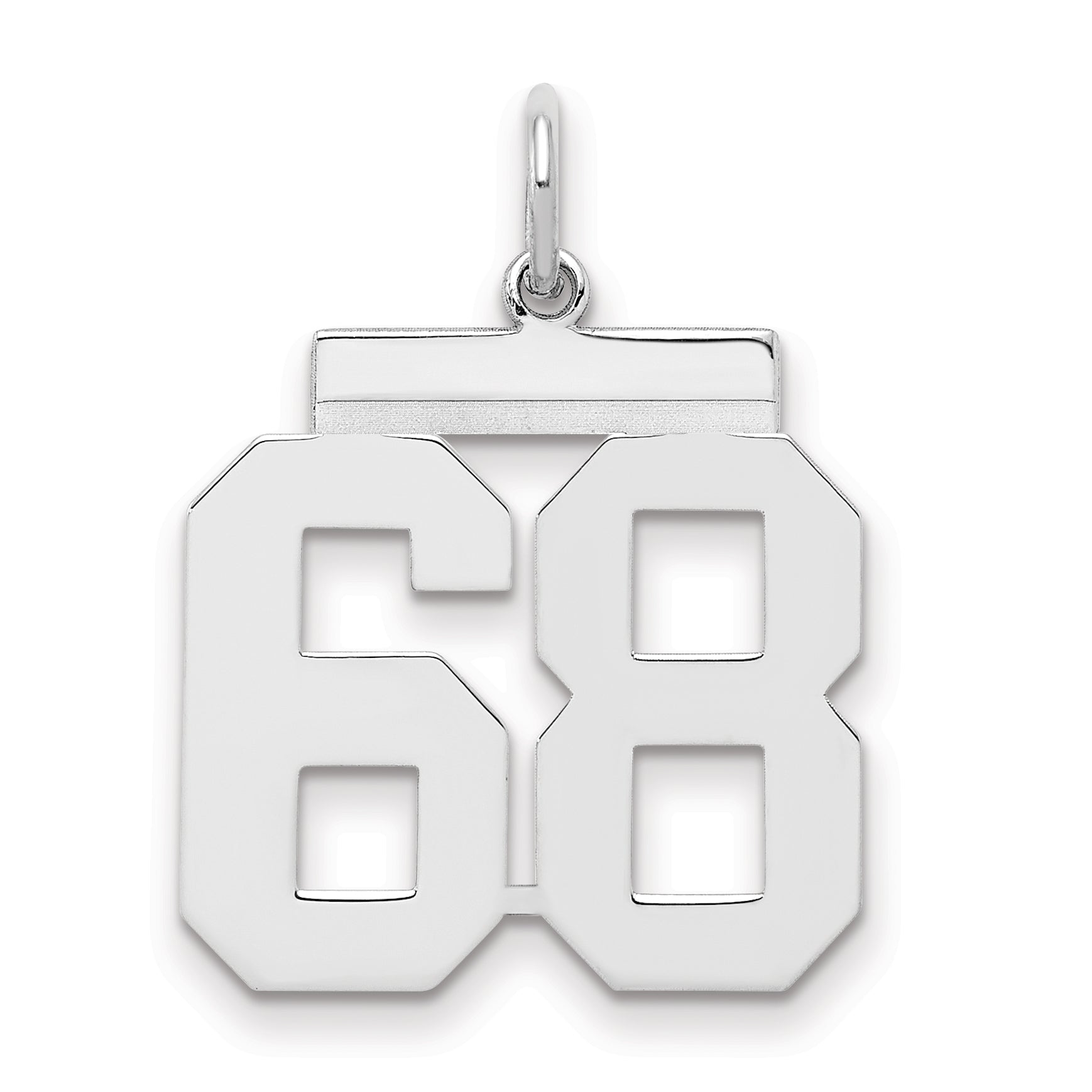 Introducing the Sterling Silver Rhodium-Plated Polished Number 68 Charm, a must-have for charm enthusiasts. Crafted from high-quality 925 sterling silver, this charm gleams with a polished finish that catches the light beautifully. With rhodium plating, it resists tarnish while offering a white, silver-tone color that's both classic and versatile. Measuring 21 mm in length and 16 mm in width, this medium-sized charm features the iconic number 68, adding a unique touch to any jewelry collection. This Sterling Silver Number 68 Charm makes the perfect personalized gift or a stunning addition to your style.