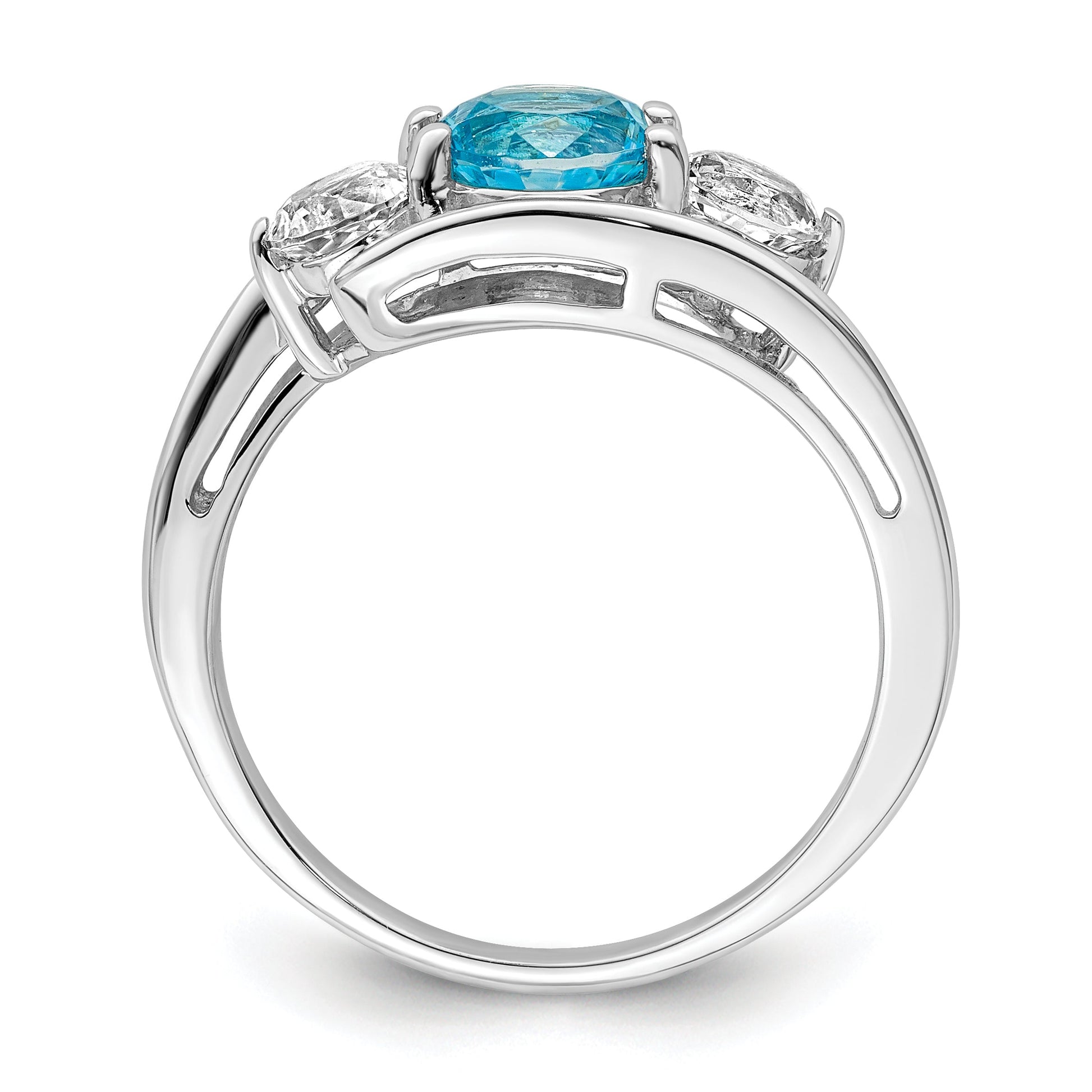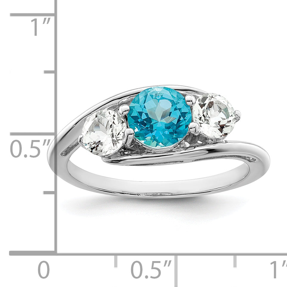 The Sterling Silver Survivor Collection Rhodium-Plated White And Blue Topaz Sue Ring stands out for its sleek design and bold look. Crafted from premium 925 sterling silver, this ring features two stunning white topaz stones and one vibrant blue topaz, all set in a polished silver tone. The tapered band, with a width from 1.8 to 3.25 mm, offers a comfortable fit. Its open back design ensures ease of wear, while the faceted stones add sparkle from every angle. Perfect for everyday wear, the Sterling Silver Survivor Collection Ruthenium Plated White and Blue Topaz Sue Ring makes a stylish statement.