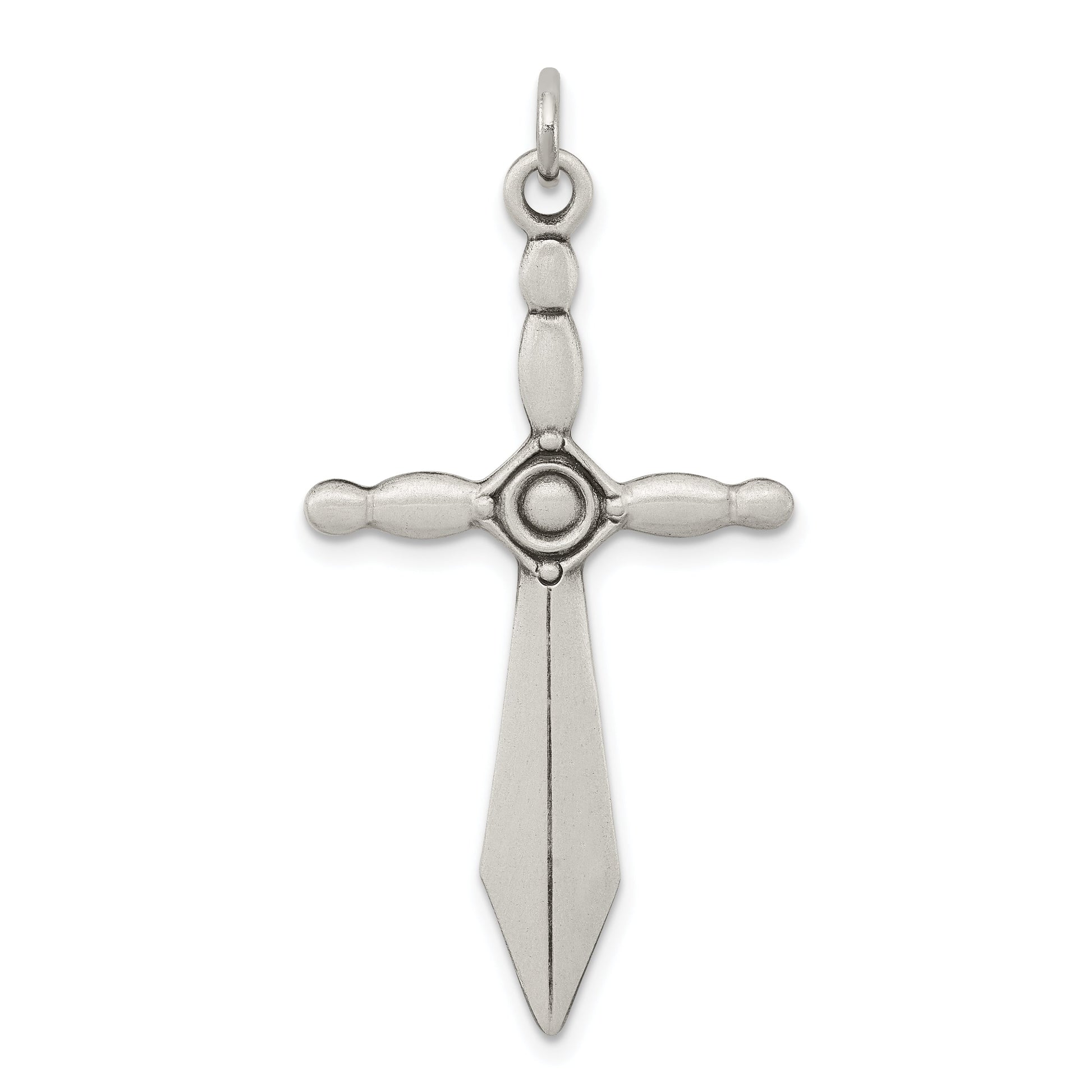 Introducing the Sterling Silver Sword Cross Pendant, a blend of elegance and history in one piece. Crafted from 925 sterling silver, this themed pendant features a polished finish. The solid construction ensures durability, while the die-struck manufacturing process adds fine detail. The cross measures 38 mm in length and 21 mm in width, making it a noticeable yet tasteful accessory. With a lovely lacquer coating, it maintains its shine for years. Add the Sterling Silver Sword Cross Pendant to your collection and enjoy a timeless piece that radiates sophistication.
