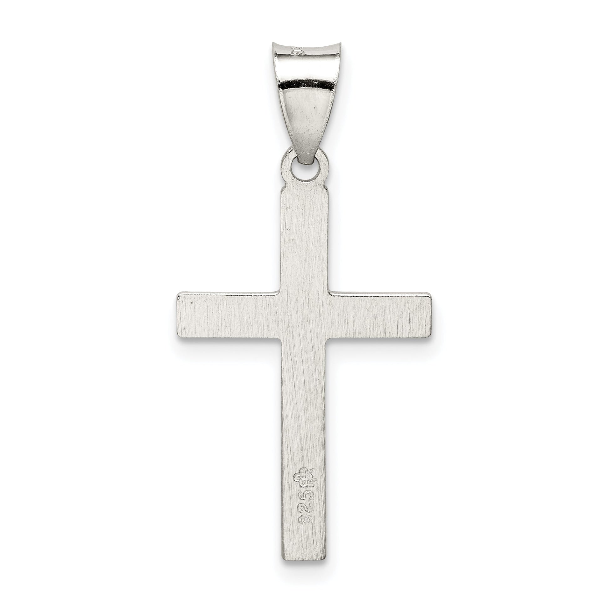 The Sterling Silver Textured, Brushed, and Polished Latin Cross Pendant is an exquisite piece that adds elegance to any outfit. Crafted from 925 sterling silver and plated with palladium, this charm shines with a smooth silver tone. The pendant measures 22.85 mm in length and 14.95 mm in width, featuring a striking solid design. Expertly die-struck, the pendant showcases a unique textured finish coupled with a classic flat back profile. Perfect for daily wear, this beautifully themed piece stands as a testament to timeless style and sophistication. Make it yours today and embrace a touch of grace effortlessly.