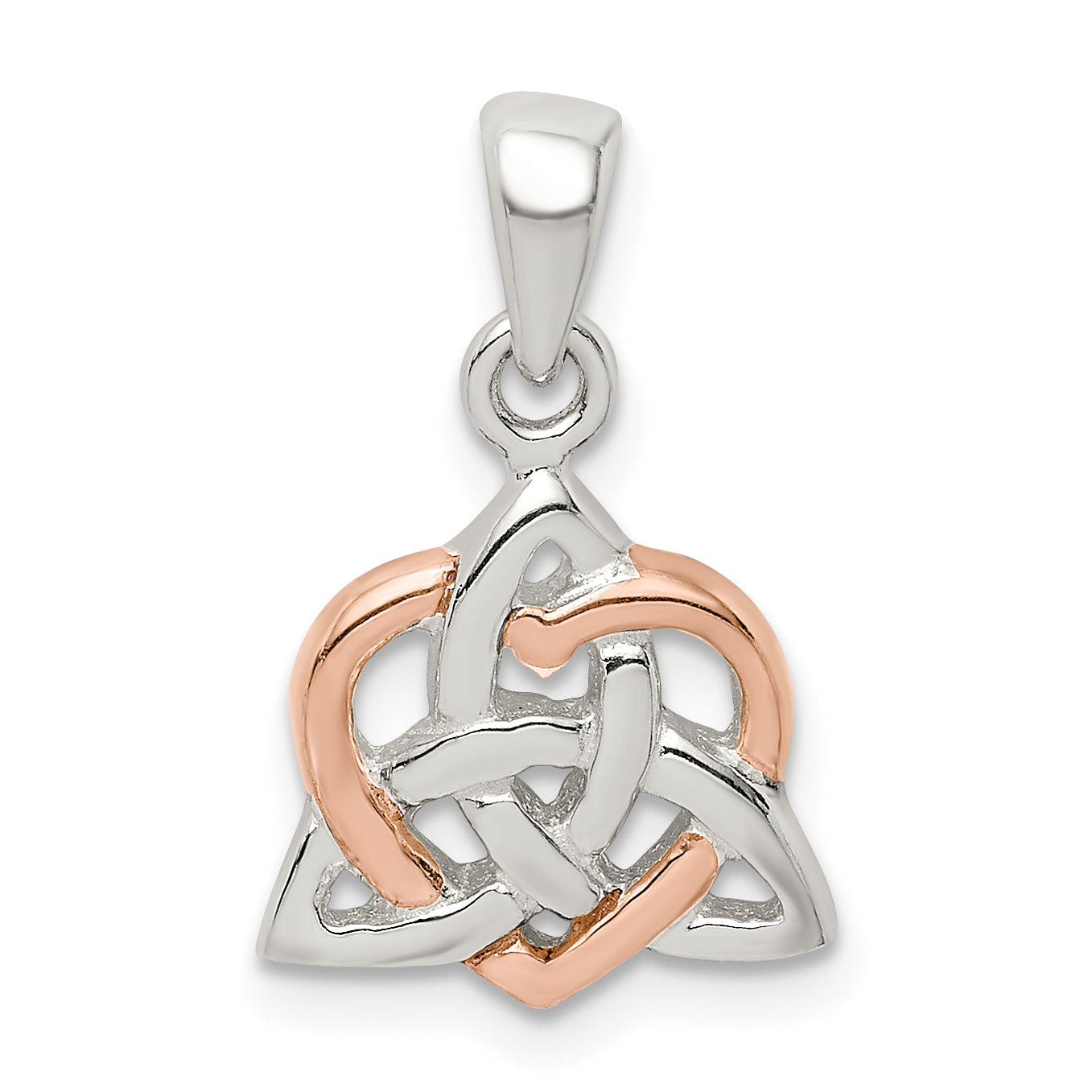The Sterling Silver Trinity Knot and Rose Tone Heart Pendant brings elegance to any outfit. Crafted from polished 925 sterling silver, this pendant features intricate trinity knot details intertwined with rose-toned accents. It's compact, with a length of 15.45 mm and a width of 12.35 mm, making it the perfect accessory for both casual and formal occasions. An anti-tarnish coating ensures lasting shine, while the delicate heart-themed design stands out. Sold as a single piece, this pendant makes an ideal gift or a lovely treat for yourself. The Sterling Silver Trinity Knot and Rose Tone Heart Pendant blends beauty and meaning flawlessly.