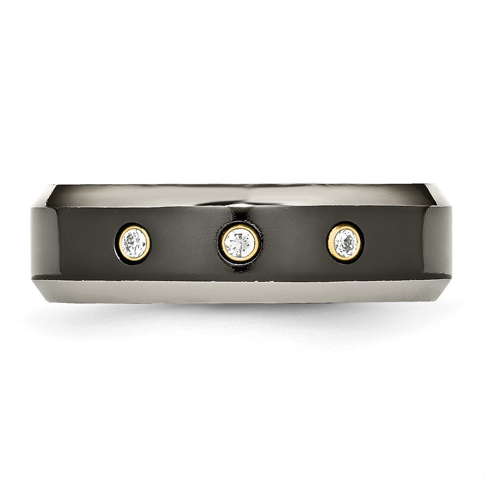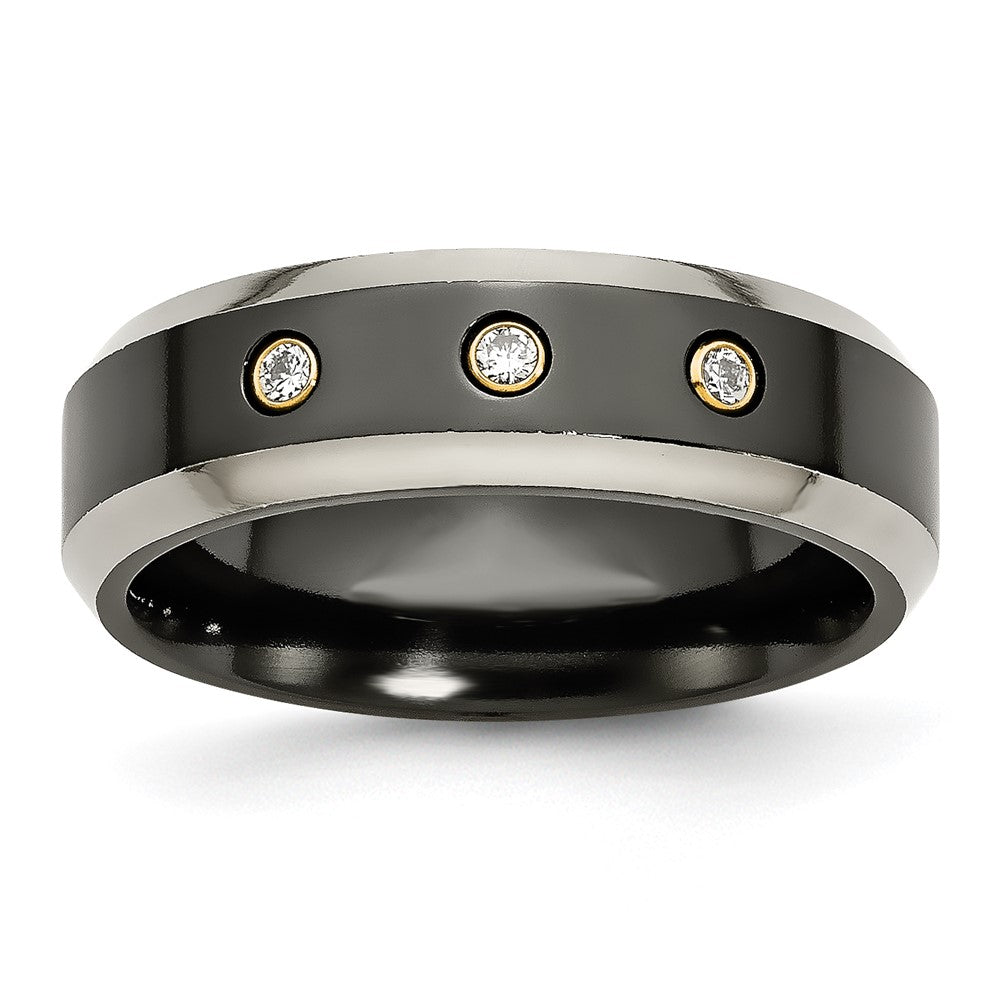 The Titanium Black Ti with 14K Inlay is a stunning wedding band that makes a bold statement. This 7mm ring features a polished finish and a beveled edge for a sleek look. It is crafted from durable titanium with a black hue and accented with three round white diamonds, totaling 0.09 carats. The diamonds add sparkle without overpowering the design. Designed for both men and women, this ring is perfect for those who love style and strength. With its natural stones and tough build, Titanium Black Ti with 14K Inlay is a true symbol of lasting love.
