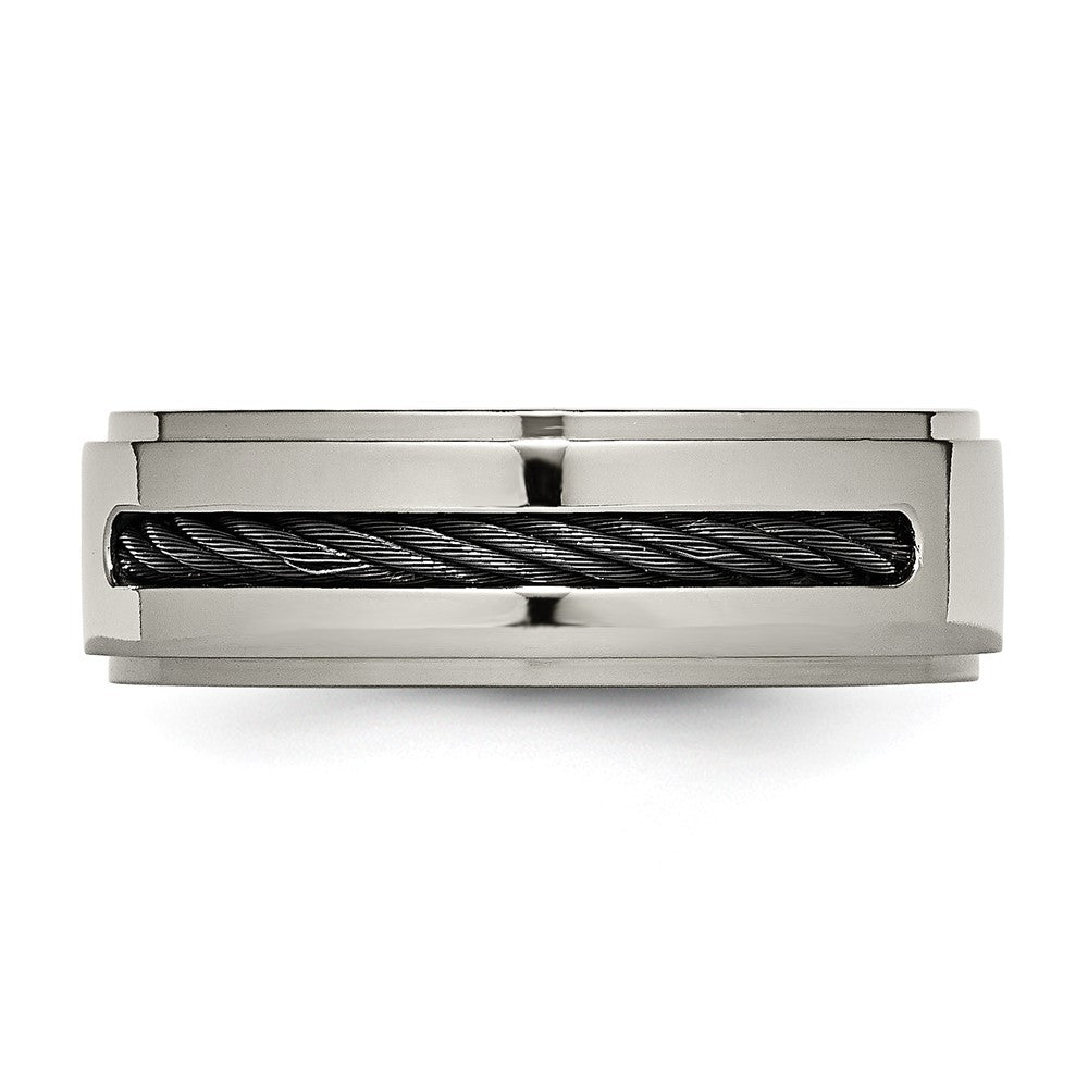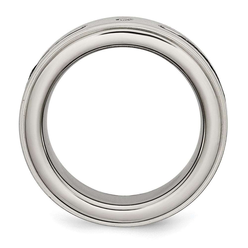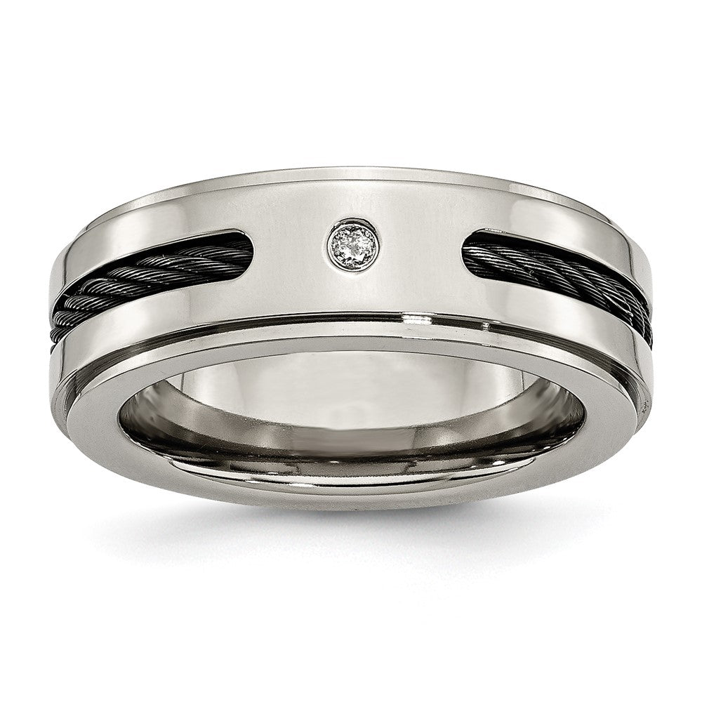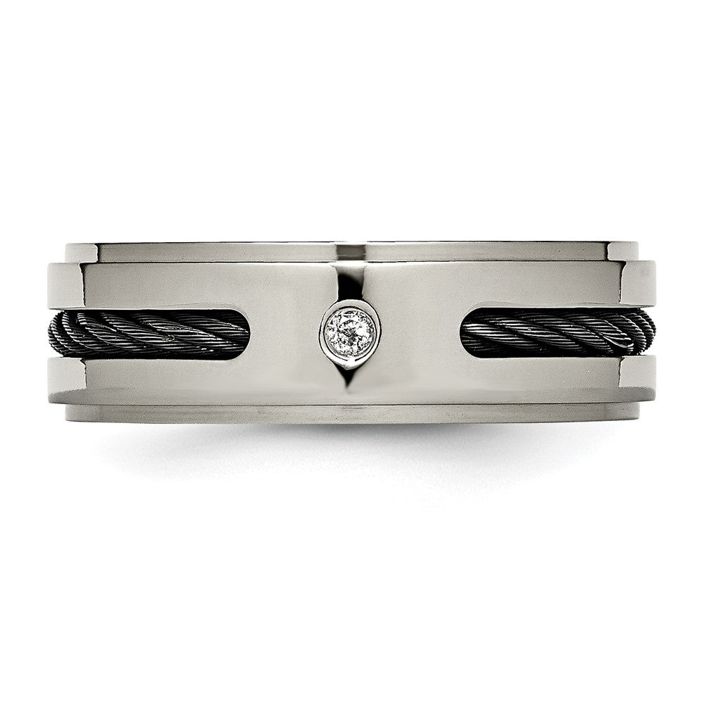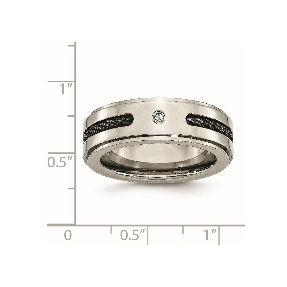 Introducing the Titanium Polished Black IP-Plated Cable/0.035Ct. Diamond Band, a sleek choice for modern jewelry lovers. Crafted from durable titanium, this unisex ring features a shiny black IP coating that gives it a bold, stylish look. A single white diamond, weighing 0.035 carats, adds a touch of elegance and sparkle. With an 8 mm wide band, it offers a comfortable fit for everyday wear. Perfect as a wedding band or a statement piece, the Titanium Polished Black IP-Plated Cable/0.035Ct. Diamond Band combines strength and style in one stunning piece that’s built to last.