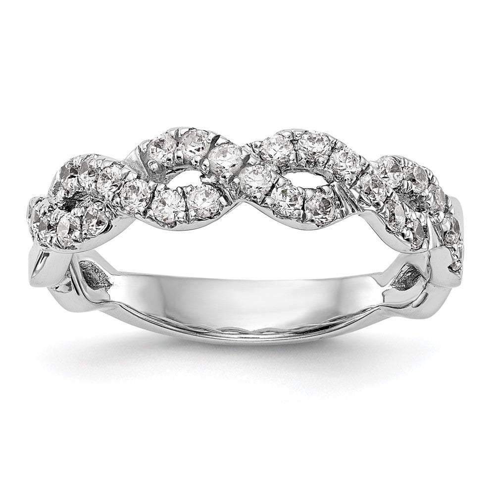 Introducing the True Origin 14K White Gold 1/2 Carat Lab Grown Diamond VS+ F+ Intertwined Complete Band. This elegant ring features a stunning design with 28 round lab-grown diamonds, creating a beautiful sparkle. The polished finish and rhodium plating add a luxurious touch. This band not only shines but is also solid and enduring, making it perfect for everyday wear or special occasions. Celebrate your love story with a ring that symbolizes forever. The True Origin 14K White Gold 1/2 Carat Lab Grown Diamond VS+ F+ Intertwined Complete Band is a must-have for any jewelry lover.